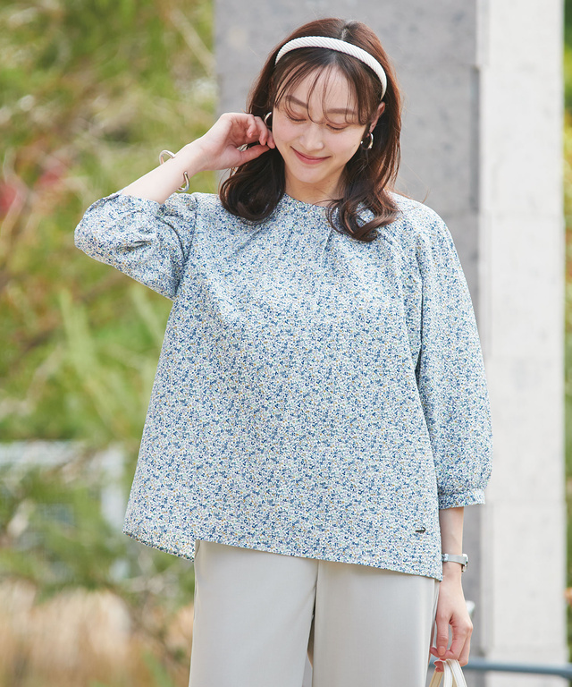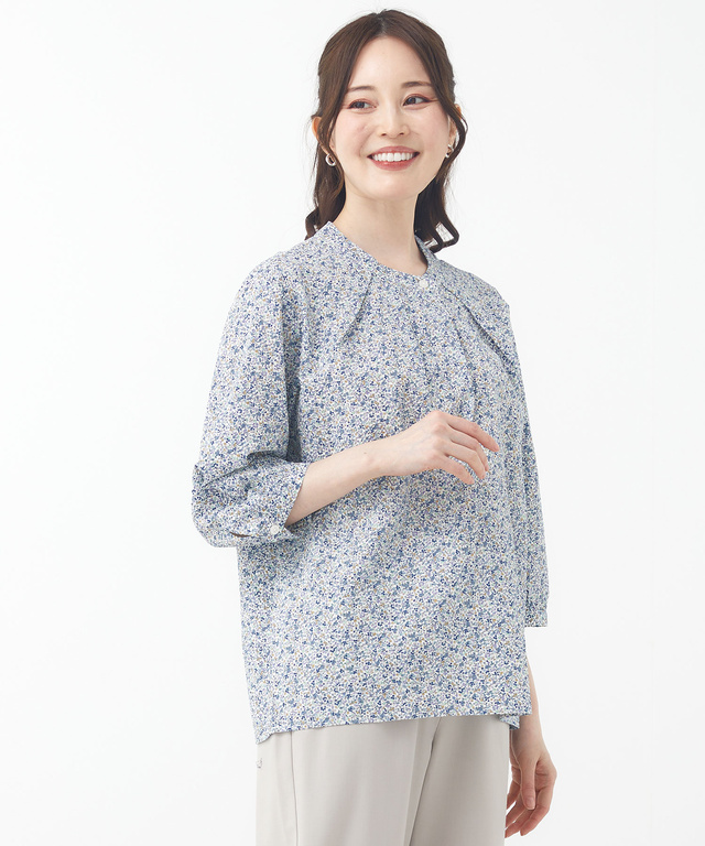 小花柄のプリントを施した襟デザインブラウス。JAPAN FABRICを使用した、アイロンが要らないイージーケア性のあるデイリーユースにも最適なアイテムです。
