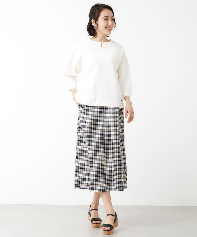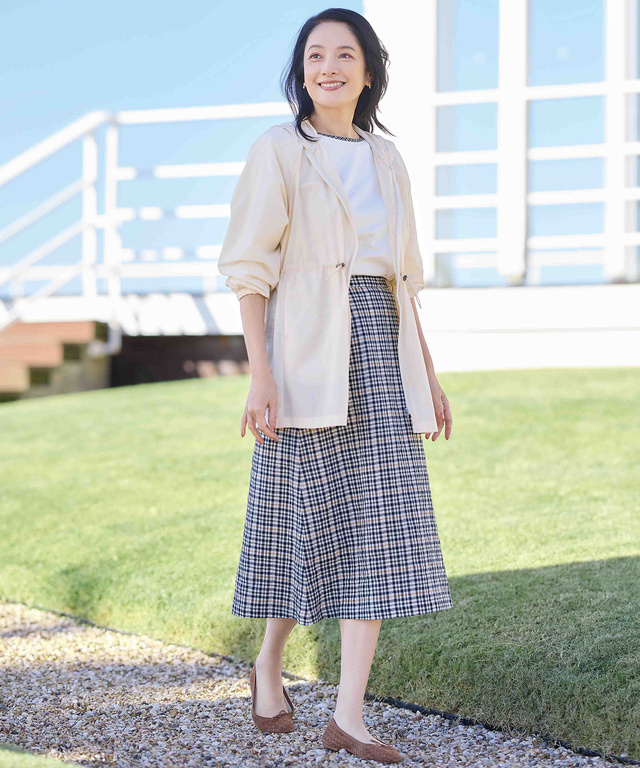 大柄が特徴のクロコダイルタータン生地を使用したウエストゴム入りのフレアスカート。皺になりにくく汚れも取れやすい素材感で、裏地付きなのでデイリー使いにも最適です。