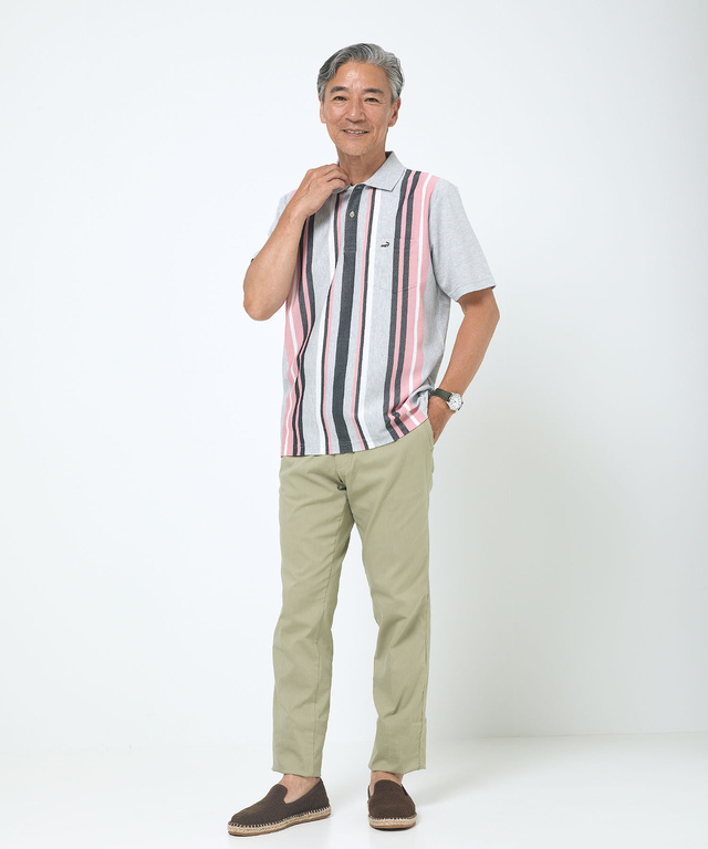 夏に嬉しい吸汗速乾機能が付いているストライプ柄ポロシャツです。ランダムにデザインされたストライプ柄が清涼感のある爽やかな印象のスタイリングを楽しんでいただけます。