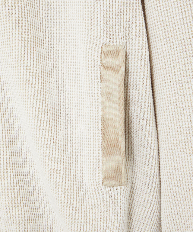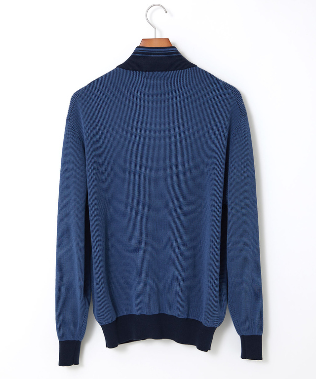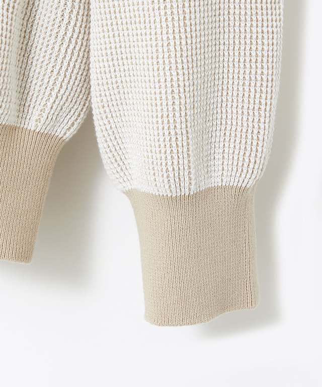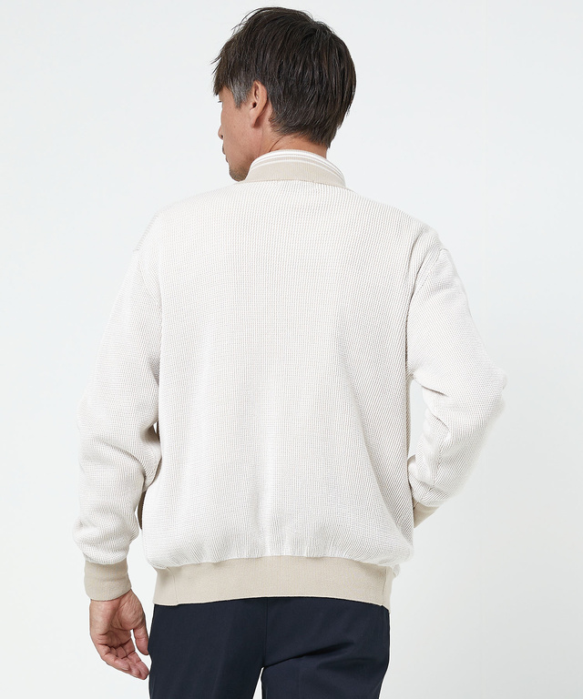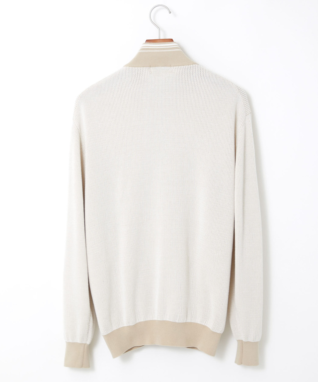 地球環境に配慮したコットンを使用したニットカーディガンです。濃淡の2色を使い立体感のある地柄を表現した、上品なアイテムです。ベージュとネイビーの2色展開でご用意しております。