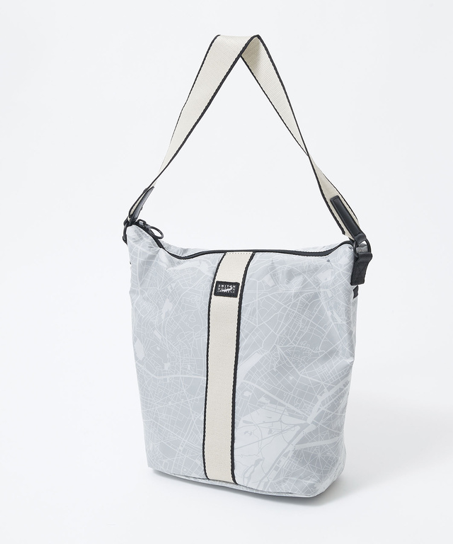 パリの地図をモチーフにしたオリジナル柄をプリントしたバケットバッグ。広めのマチで容量がたっぷりと入り、デイリー使いにおすすめです。