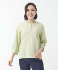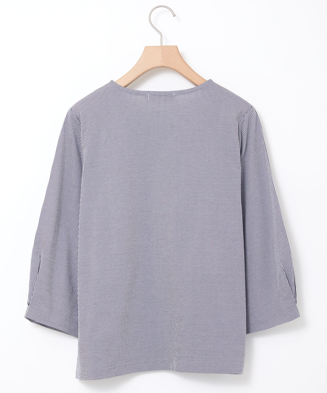 シャツ生地の様なストライプサッカー素材を使用した、カットソーのブラウス。薄手で柔らかく適度に張り感のある素材なので、楽な着心地ながらだらしなく見えないお出かけに使いやすいアイテムです。