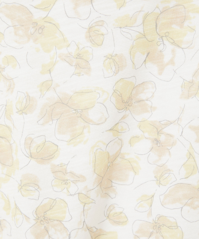 薄手の天竺生地に水彩画の様な花柄をプリントをした七分袖Tシャツ。淡い色合いで派手にならずに春らしさを演出していただける、シャツのインナーとしても使いやすいアイテムです。