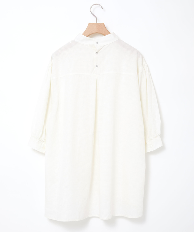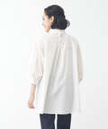 スノーコットン生地を使用した、裾のシルエットに前後差をつけたプルオーバーチュニック。動きのある裾のラインと袖のディテールは軽やかでありながら、体型カバーにもなるシルエットになっています。