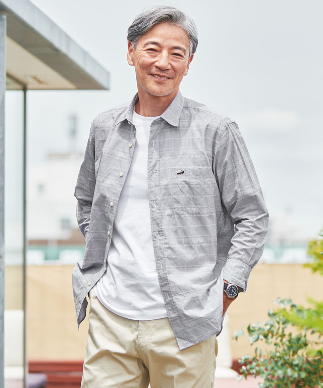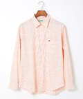 無地ライクなドビー素材のチェック柄シャツです。中にTシャツを着こんで羽織りとしても着ていただけます。ソフトな風合いのオレンジとネイビーの2色展開でご用意しております。