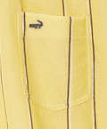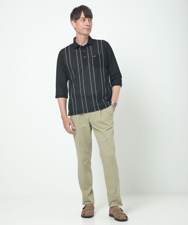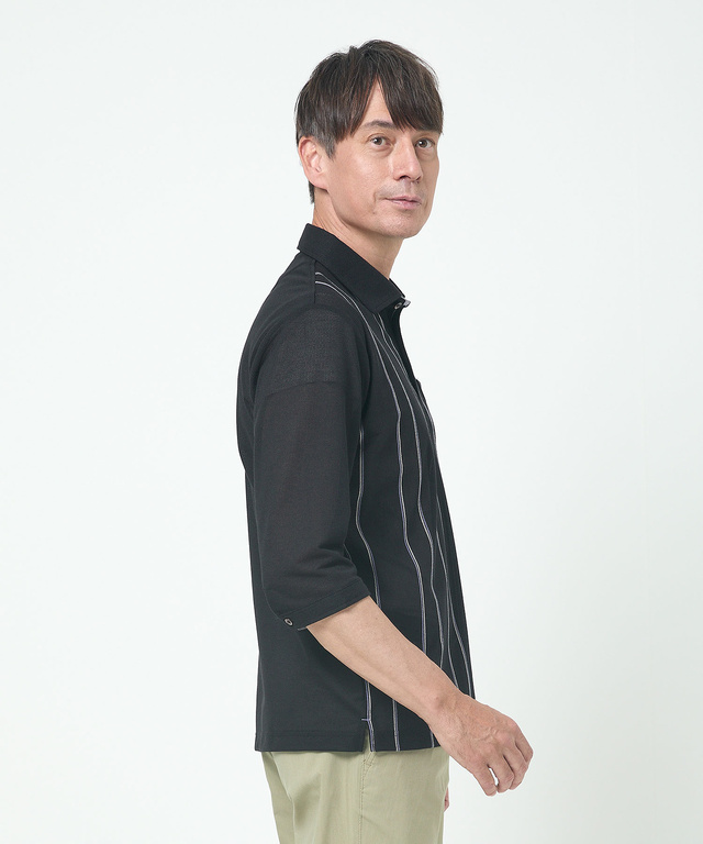 7分袖で前身頃にストライプ柄をデザインしたポロシャツです。カフスの仕様の袖と折り返し部分のさりげない柄が上品な印象で、お出かけにもおすすめです。