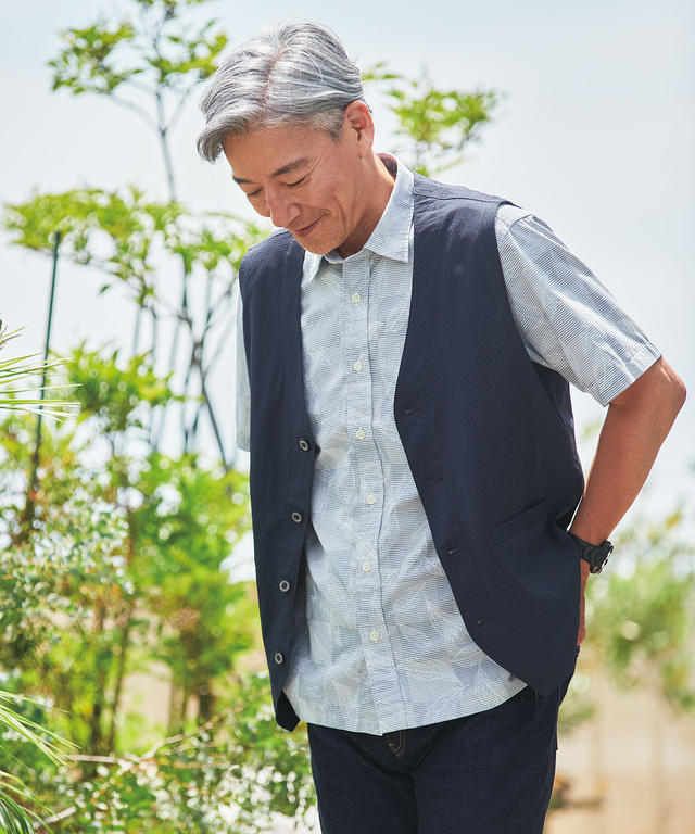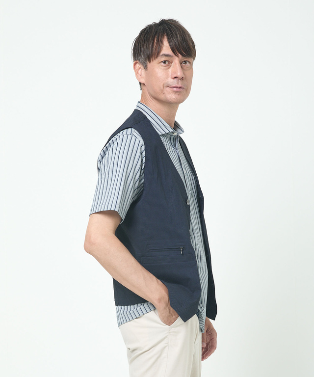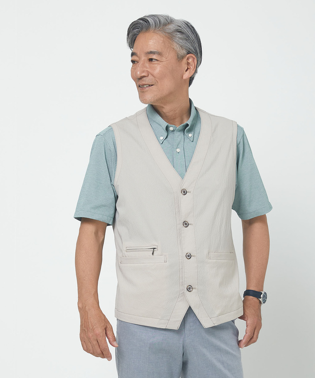 ストレッチサッカー生地を使用したジレタイプのベストです。軽く涼しいためサラッと着用していただけます。