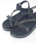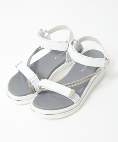 華やかさと使いやすさを両立したプラットフォームサンダル。甲の部分のビジューストラップとソールに配したメタリックテープで程よいゴージャス感を醸し出した一足。