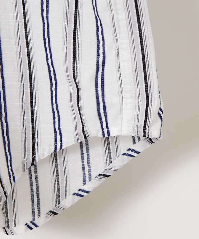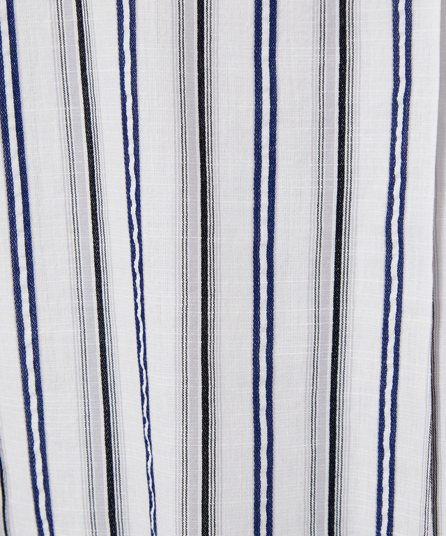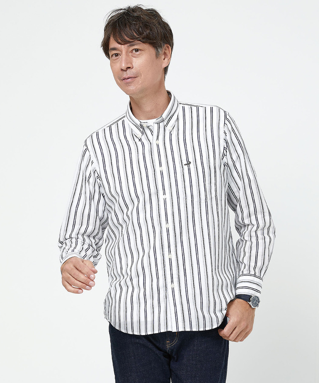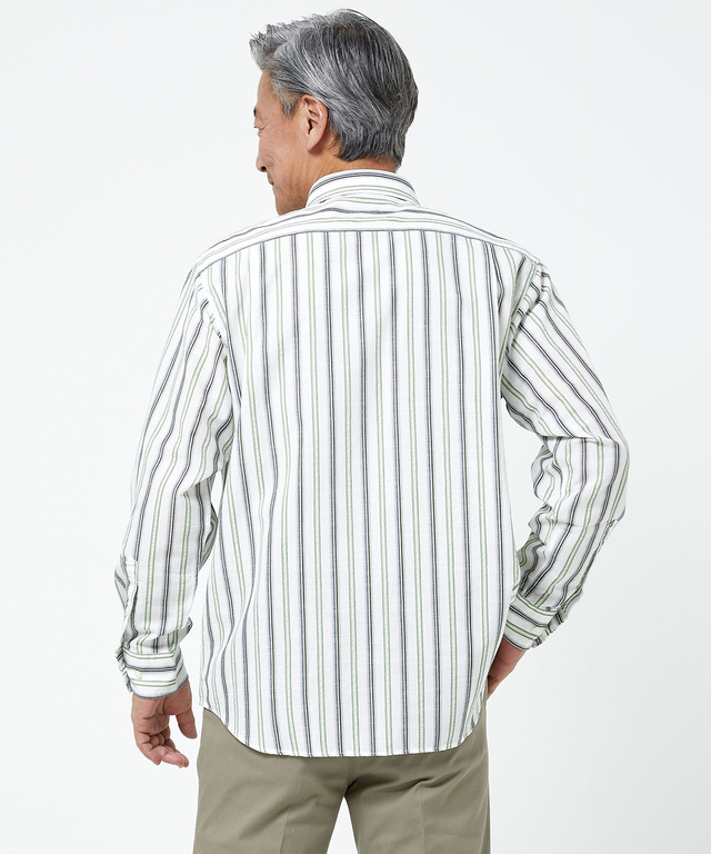 日本製生地を使い、SDGS素材の「SOALON」高純度の樹木(天然パルプ)を主原料とした肌に優しい素材で湿気を素早く蒸発させ気化熱を奪うことで繊維自身が冷やされ涼しさを感じられる素材を使用した吸汗速乾・接触冷感機能があるシャツです。ストライプ柄により春夏らしい爽やかな印象のアイテムになっております。