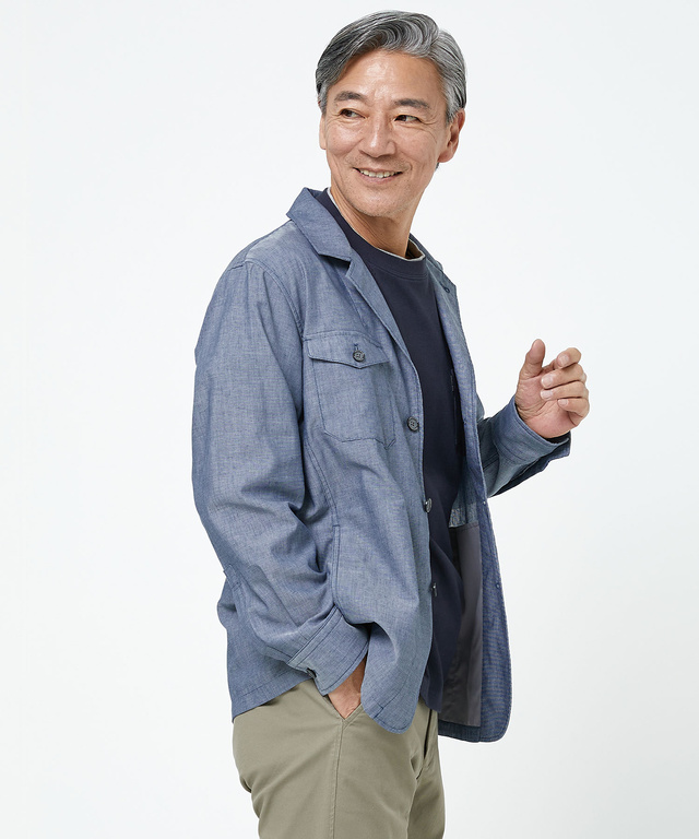 パマナ織り素材で清涼感や麻特有のシャリ感があるシャツジャケットです。サファリテイストを感じるデザインになっており、ジャカード リーフ柄 シャツをインナーとして着ていただくスタイルもおすすめです。
