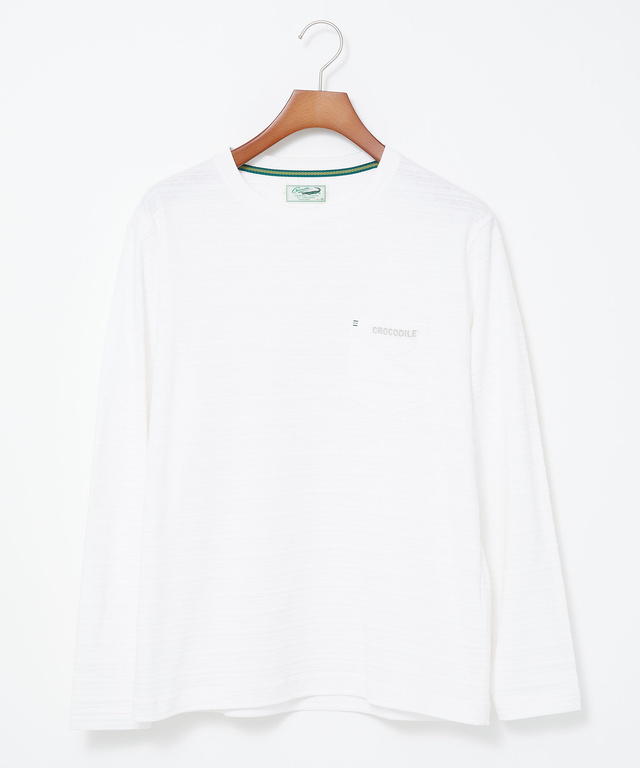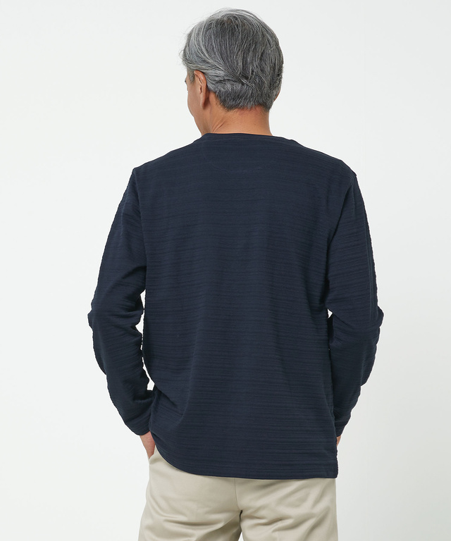 ハッキリとした凹凸感のあるカジュアルな雰囲気のシャドーボーダー柄のカットソーです。襟ぐりのストライプテープカラーにリンクした胸ポケットのバータックがアクセントとなっております。シンプルなデザインのため着回しがしやすく、1枚持っておくと便利なアイテムです。