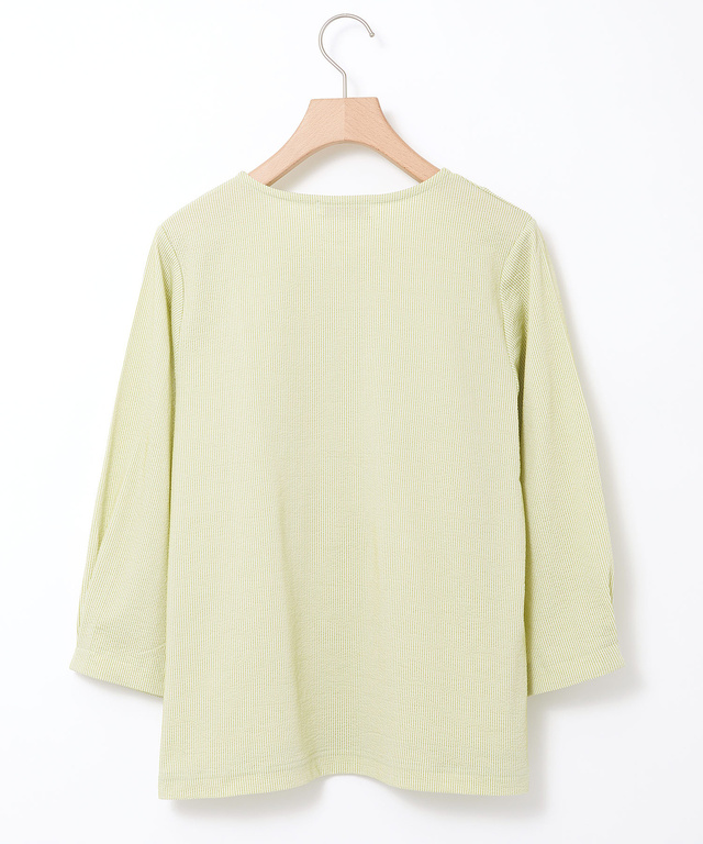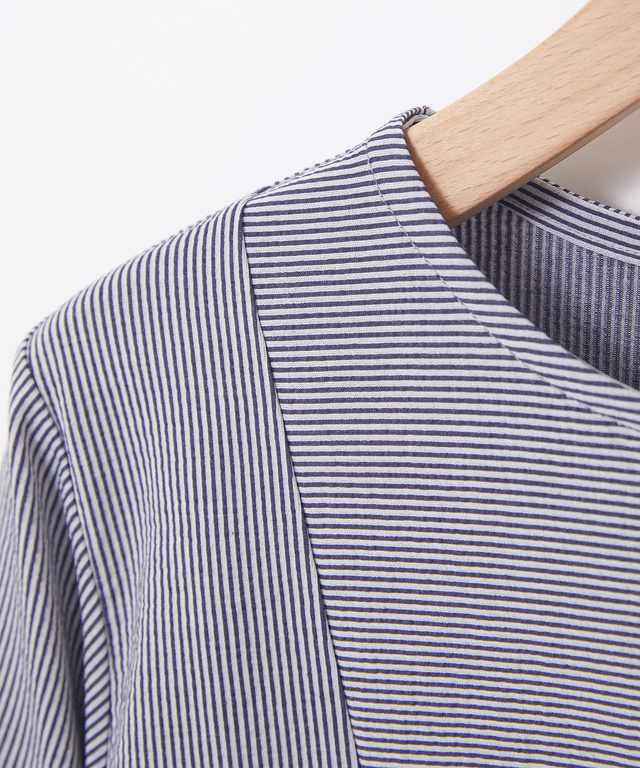 シャツ生地の様なストライプサッカー素材を使用した、カットソーのブラウス。薄手で柔らかく適度に張り感のある素材なので、楽な着心地ながらだらしなく見えないお出かけに使いやすいアイテムです。